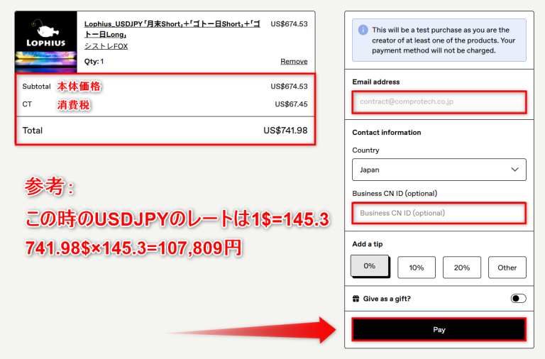 決済システムが海外プラットフォームのため、お会計は米ドルでの決済になります。